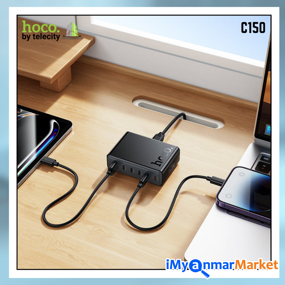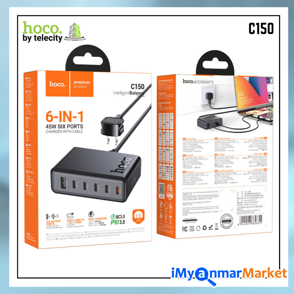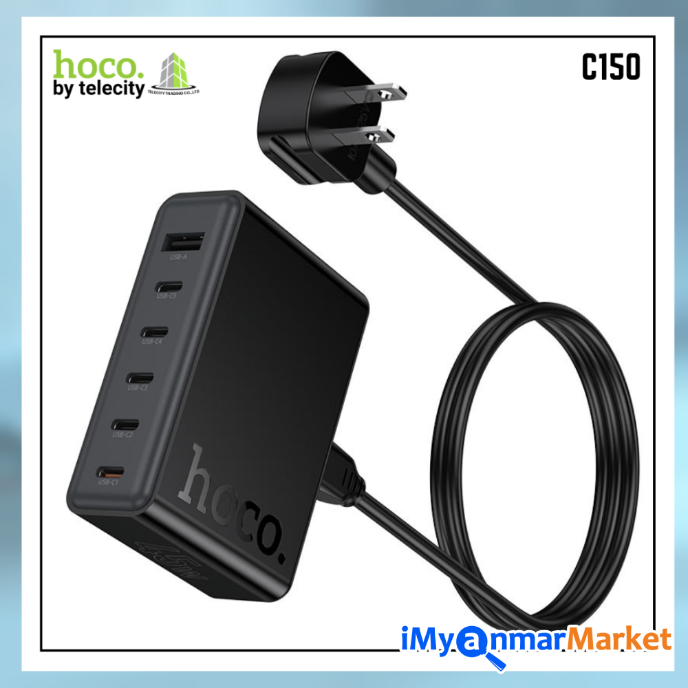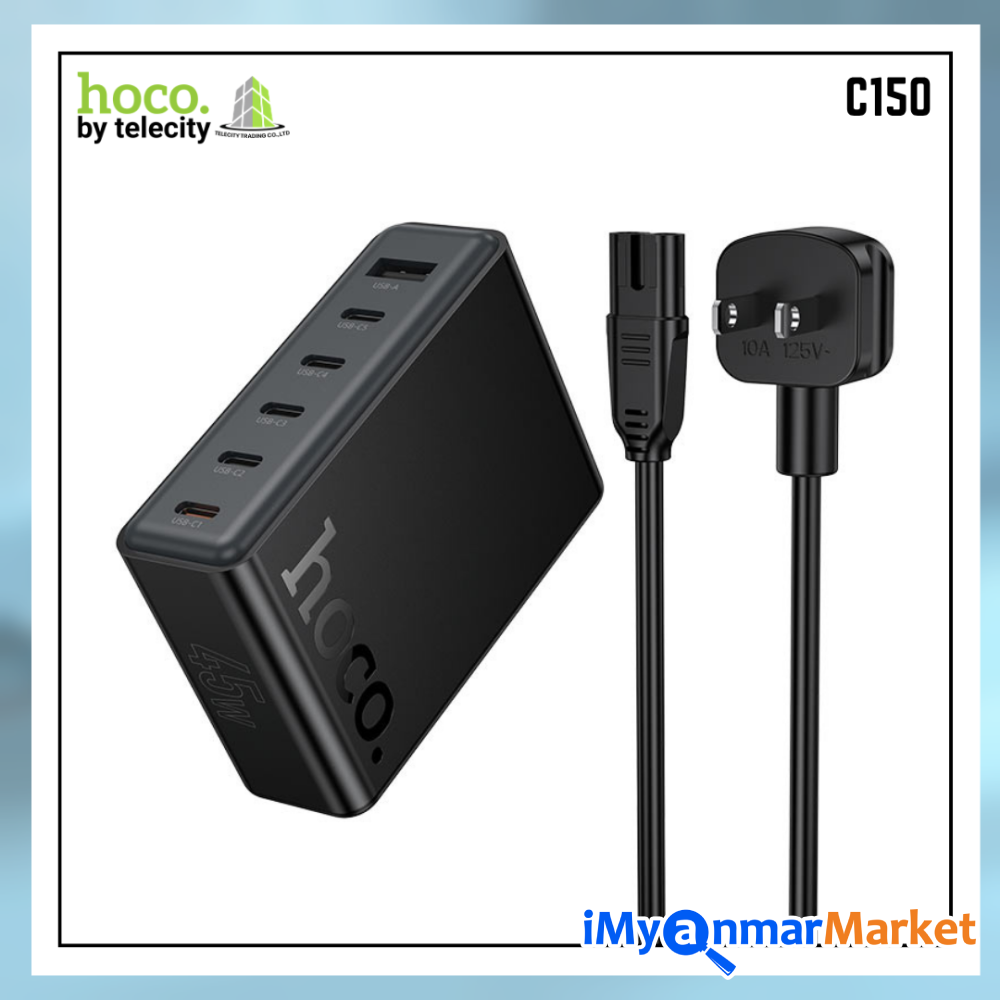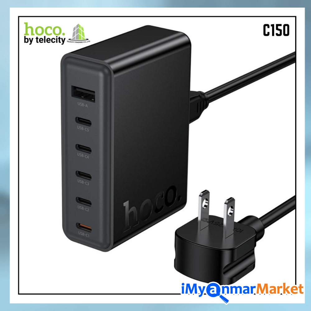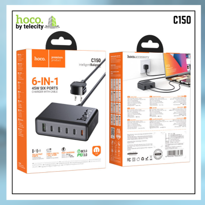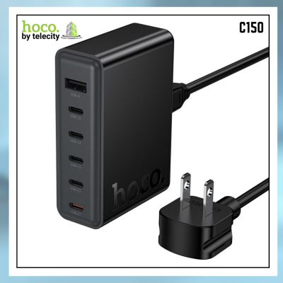C150 Modern, single USB-A and 5 Type-C ports charging station, detachable power cord, US plug