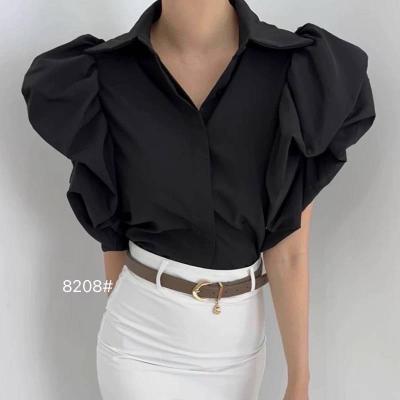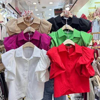 Plain color shirt with ruffled sleeves, collared neckline, front buttons that can be unbuttoned for actual use, sewn with pleats all around, beautiful and luxurious.