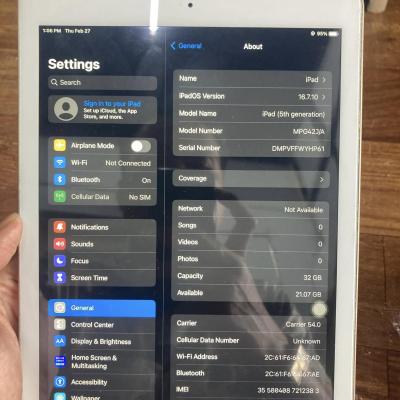 i pad 5 Gen (2017) 9.7 inches 2GB RAM 8800 mah Apple A9 processor By pass(No Reset) Finger ရ Home Key ရ All fine No error Price : 350,000 Ks ဘက်ထရီ မနက် ၁၀၀ ည ၁၀၀ iOS 16.7 App အကုန် နီးပါး သုံးနိုင်ပါတယ်။