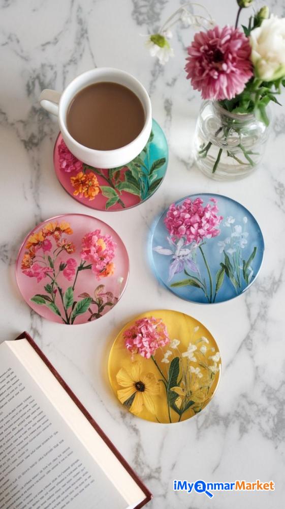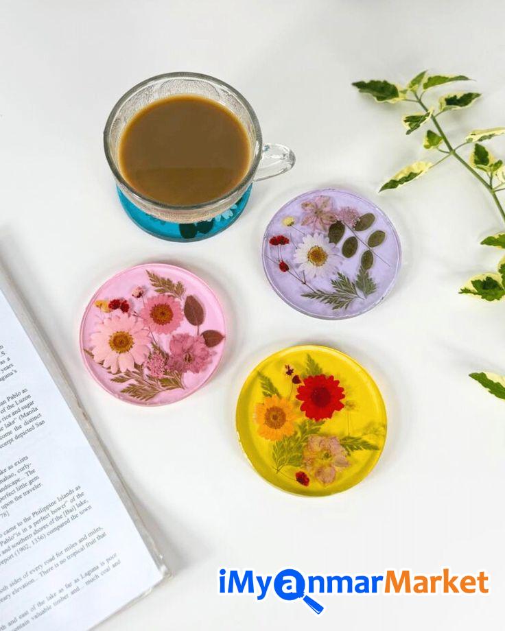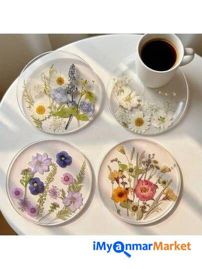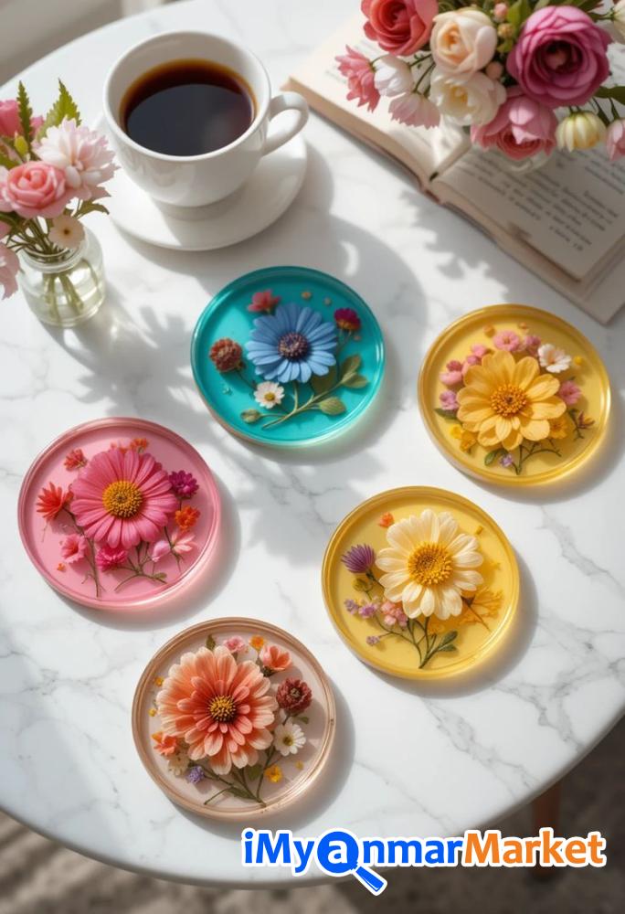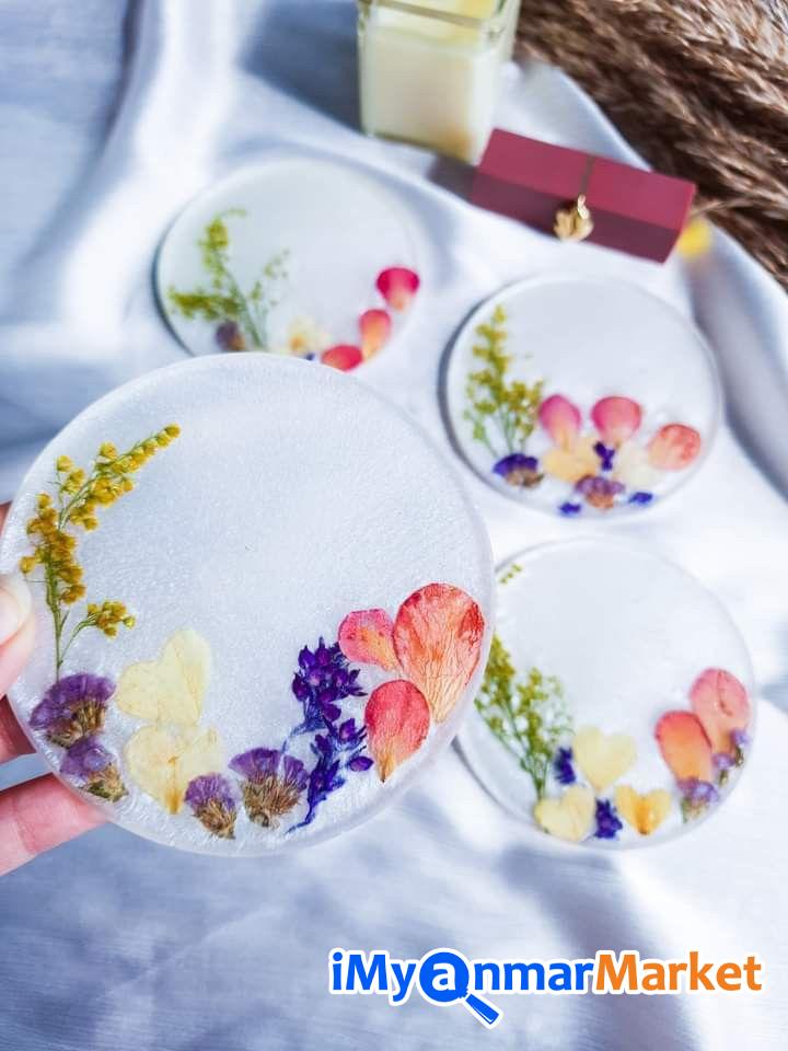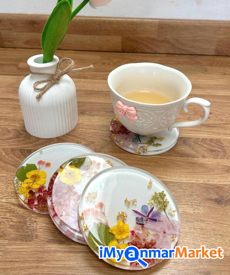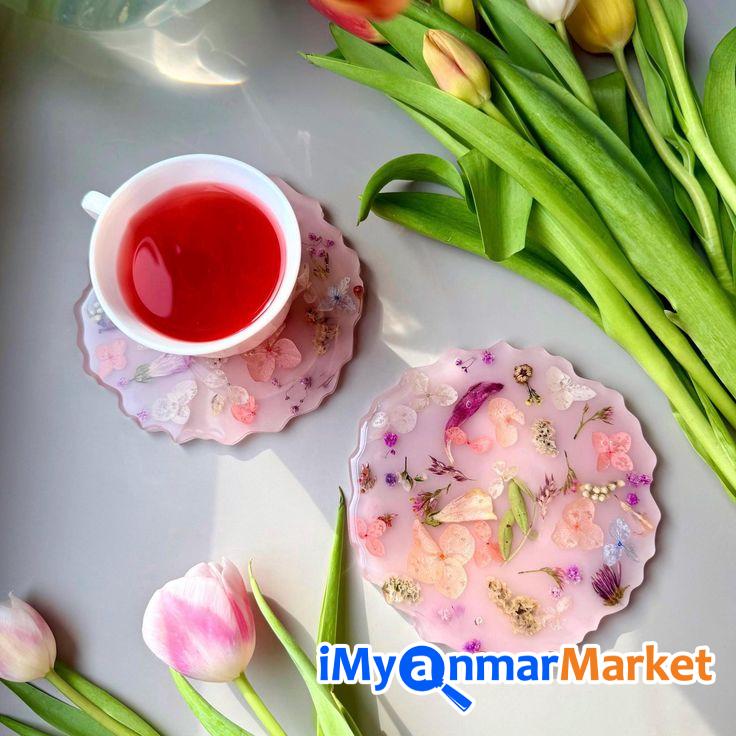 ဒီ Set လေးဟာ ရိုးရိုးရှင်းရှင်းနဲ့ အဆင့်အတန်းရှိတဲ့ ဒီဇိုင်းလေးဖြစ်ပါတယ်။ ကြည်လင်နေတဲ့ Resin အသားထဲမှာ သဘာဝ ဒေစီပန်းခြောက်လေးတွေ၊ သစ်ခက်လေးတွေနဲ့ ရွှေမှုန်လေးတွေကို အနုစိတ် ထည့်သွင်းဖန်တီးထားတာမို့ ဧည့်ခန်းစားပွဲပေါ်မှာပဲဖြစ်ဖြစ်၊ ထမင်းစားပွဲပေါ်မှာပဲဖြစ်ဖြစ် တကယ့်ကို Premium ဆန်တဲ့ အငွေ့အသက်ကို ပေးစွမ်းနိုင်မှာပါ။ ကိုယ့်ရဲ့အိမ်လေးကို အမြဲတမ်း လှလှပပနဲ့ သပ်သပ်ရပ်ရပ်လေး ဖြစ်နေစေချင်တဲ့ ချစ်မိတ်ဆွေ အိမ်ရှင်မတို့အတွက် အမြင်အာရုံကိုပါ ကြည်နူးစေမယ့် Setလေးတွေဖြစ်ပါတယ်ရှင့် ဧည့်သည်လာတဲ့အခါ ကော်ဖီနဲ့ မုန့်လေးတွေ တည်ခင်းဧည့်ခံဖို့ အရမ်းကို သင့်တော်ပါတယ်။ ဧည့်သည်တွေရဲ့ အထင်ကြီးလေးစားမှုကို ရရှိစေမှာရှင့် ( ၅ခု ၁တွဲ ကို ၄၅၀၀၀)
