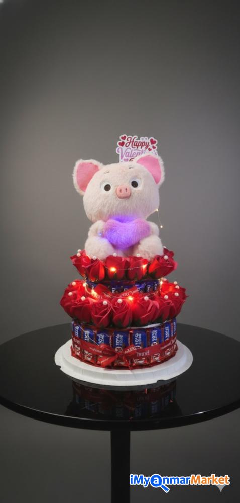 နူးညံ့တဲ့ အရုပ်လေးရယ် ချိုမြိန်မှုနဲ့ ခမ်းနားမှုကို တစ်ပြိုင်တည်း ခံစားရစေမယ့် Premium Chocolate အရည်အသွေးမြင့် ချောကလက်တွေကို သေသပ်လှပတဲ့ Wrapping Style နဲ့ ပေါင်းစပ်ပေးထားပေးပြီး ကိတ်မုန့်ပုံစံ ဖန်တီးပေးထားတာကြောင့် မြင်ရသူတိုင်း အားကျရမယ့် လက်ဆောင်မျိုးပါ။ မွေးနေ့ပွဲတွေနဲ့ ဂုဏ်ပြုပွဲတွေမှာ လူပြောအများဆုံးနဲ့ အခမ်းနားဆုံး လက်ဆောင်တစ်ခု ဖြစ်နေမှာ အသေအချာပါပဲ။"