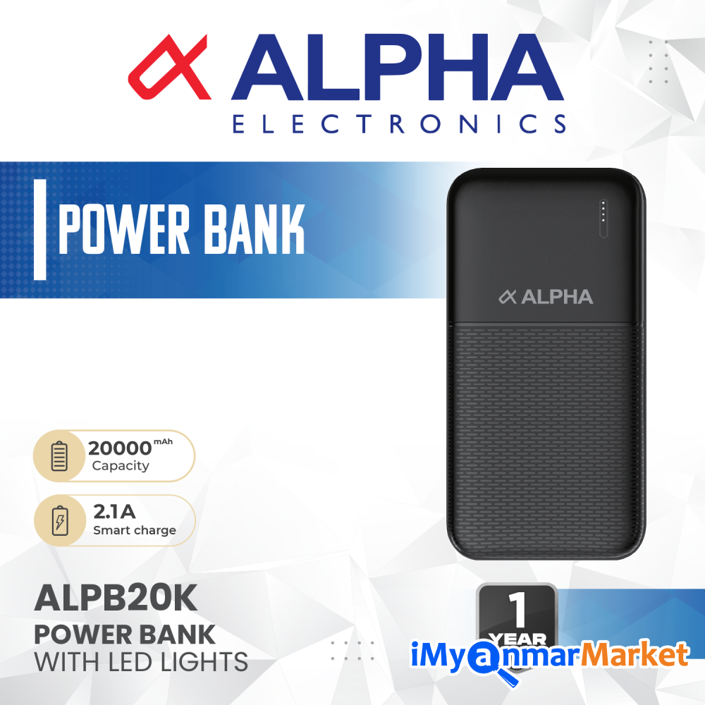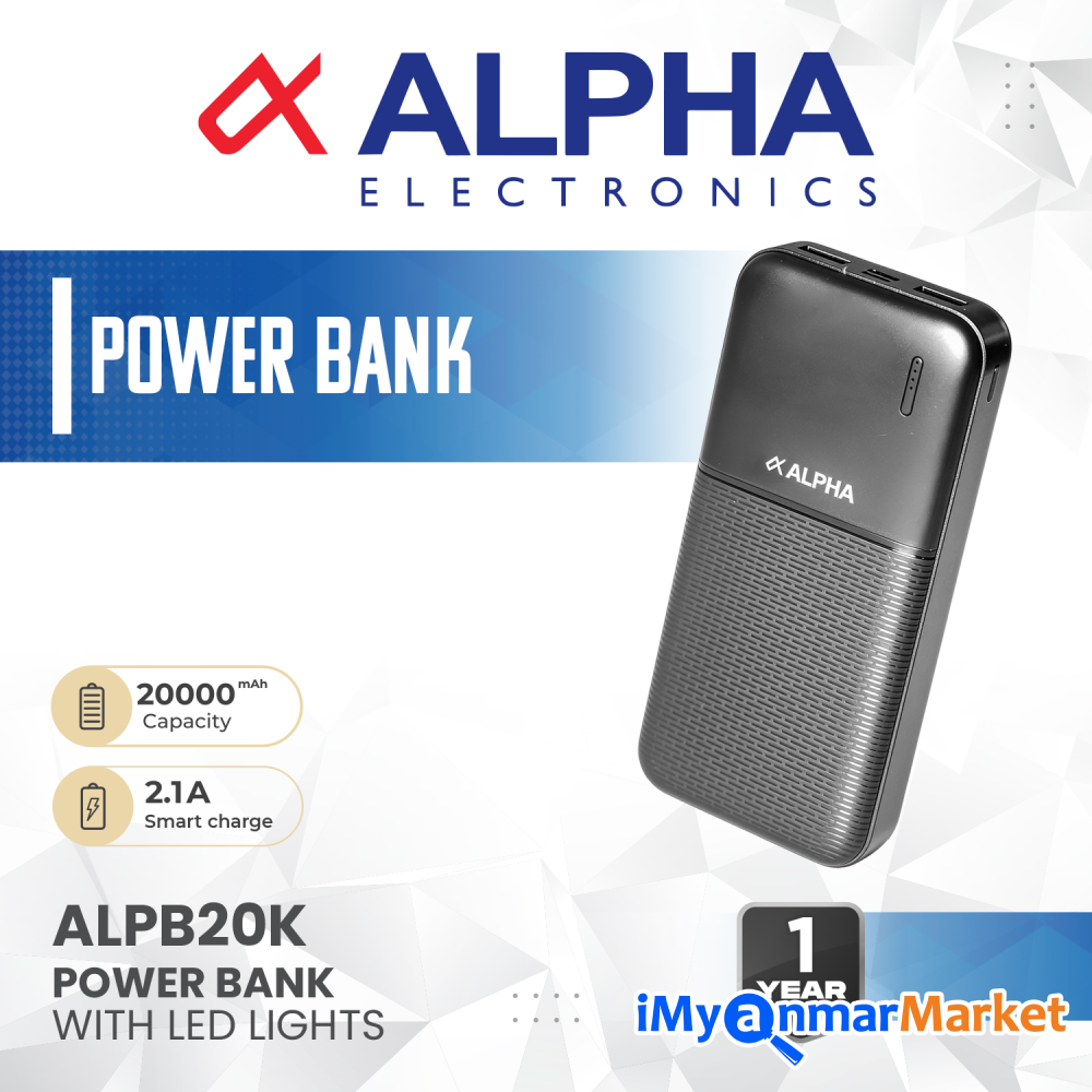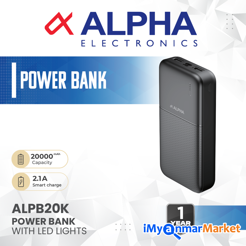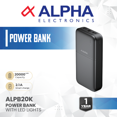 Model No Alpha Power Bank (ALPB 20K) EN- Material ; ABS / Cappacity 20000mAh/3.7V/74Wh Input; Micro /USB-C5V = 2.1A , Out Put; USB-A1/A2 ;5V=2.1A LED Incicator Capacity- 2000mAh 2.1 Smart Charge