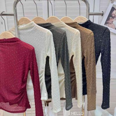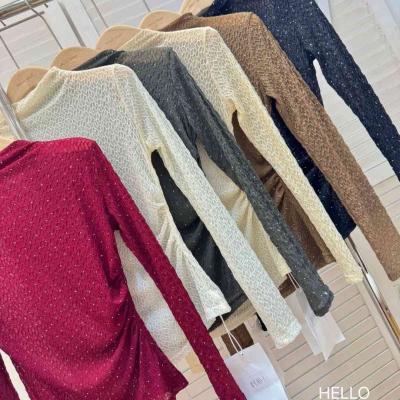 Long-sleeved crew neck shirt, see-through lace fabric, glittering glitter, shoulder/side slit details, very pretty, this model