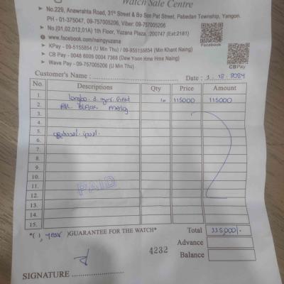 1.12.2024 ရက်တွင်ဝယ်ထားသောနာရီဖြစ်သည်။ငွေအရမ်းလိုလို့ပြန်ရောင်းရခြင်းဖြစ်ပါသည်။Error 100% ကင်းစင်ကြောင်းအာမခံပါသည်ခင်ဗျာ။ရန်ကုန်မြို့တွင်းဆိုပိုပြီးအဆင်ပြေပါသည်ခင်ဗျာ။