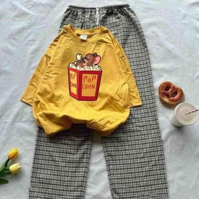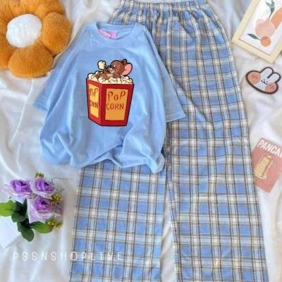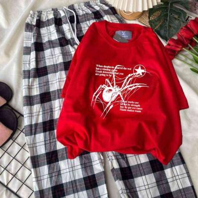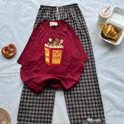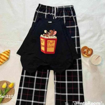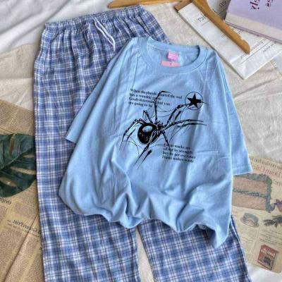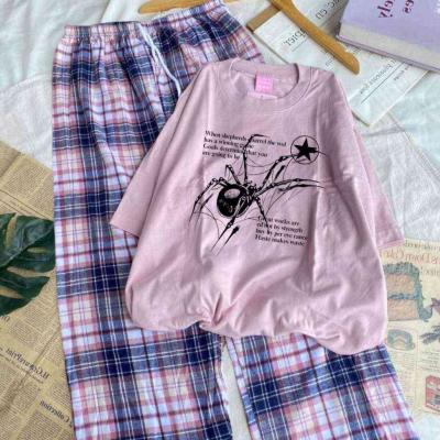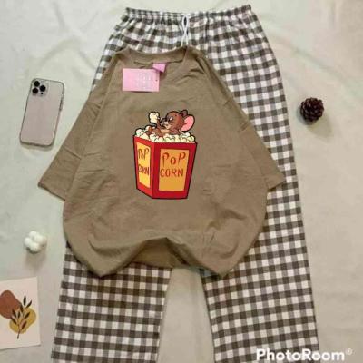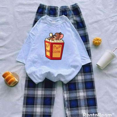 ဝမ်းဆက် ချည်သားtshirt + ချည်ကွက်ဘီရှည်