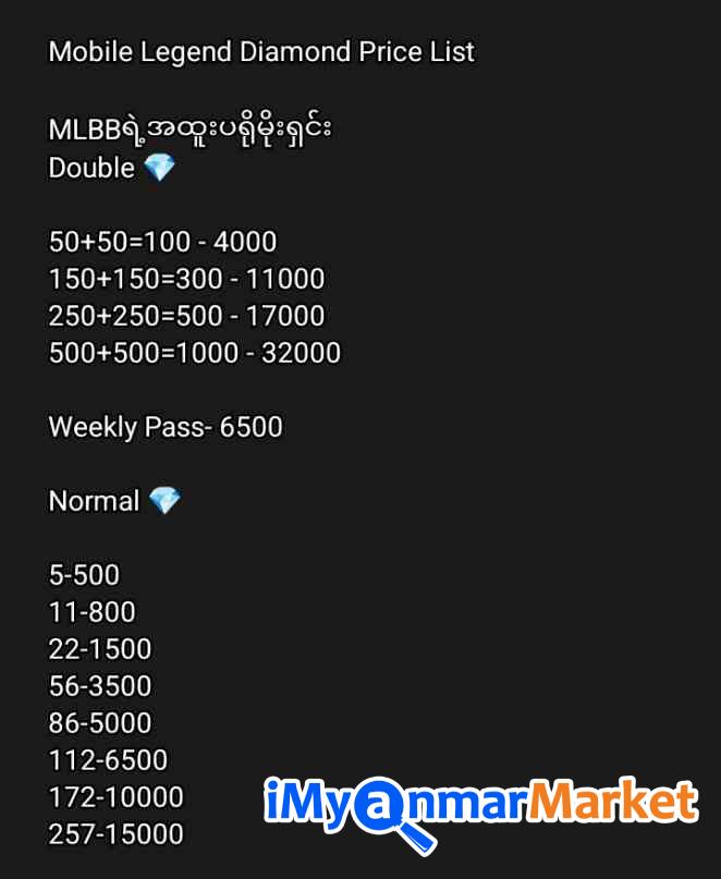 Mobile Legends Diamond များကို ဈေးစစ်မေးမြန်း၀ယ်ယူနိုင်ပြီ ဒေါ်လာဈေးအပေါ်မူတည်ပြီး ဈေးနှုန်း အနည်းငယ်ကွာဟမှုရှိနိုင်ပါသည် Weekly pass ကို 6000နဲ့အခုပို့တင်တဲ့အချိန်ရသေးတယ်နော်