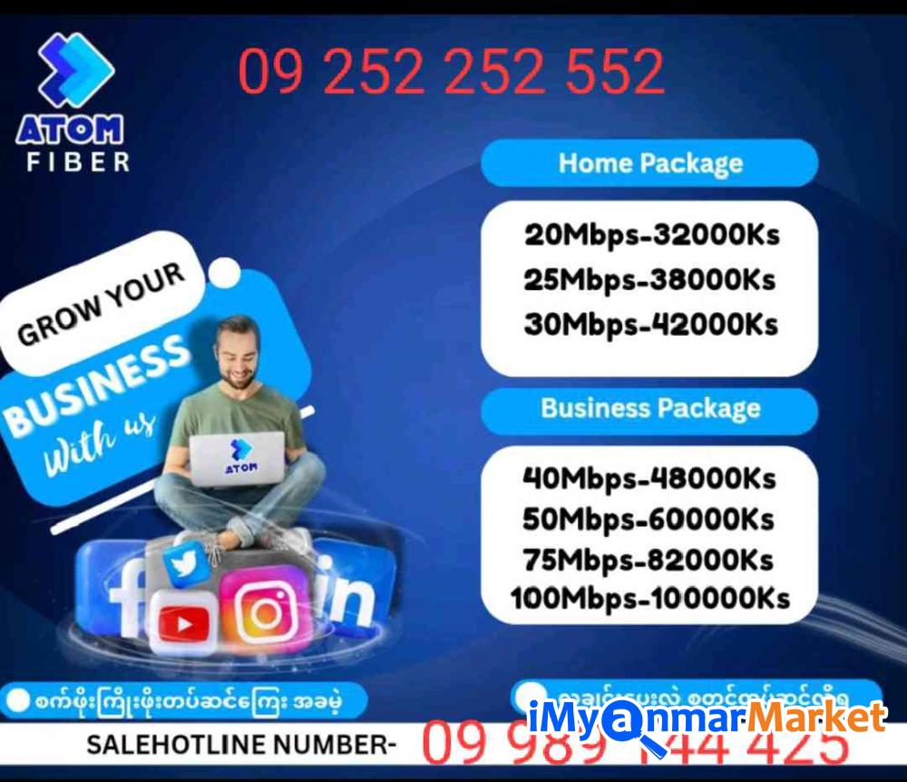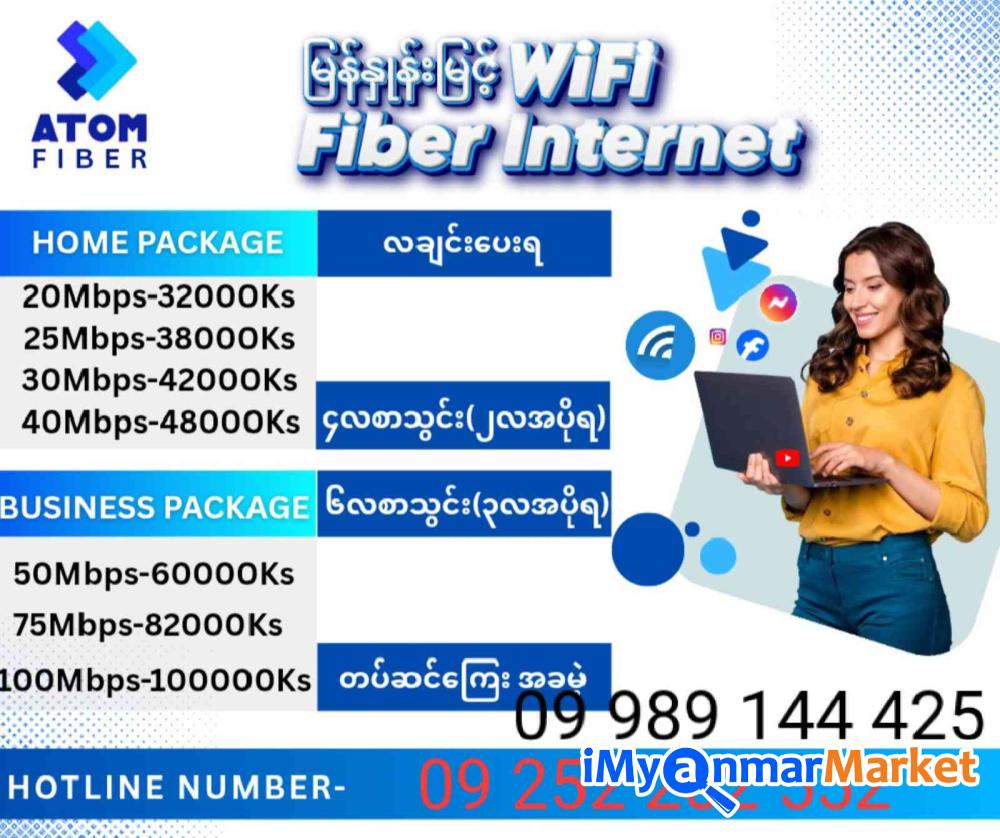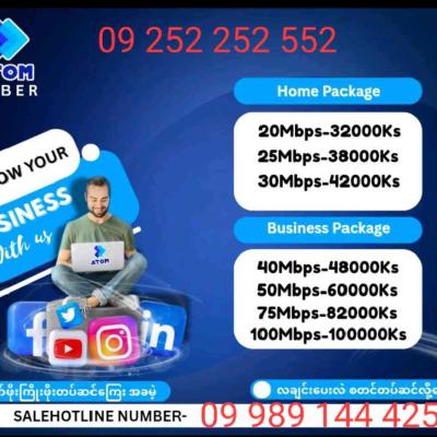 ATOM Fiber မြန်နှုန်းမြင့်အင်တာနက်စက်ကို အိမ်တိုင်ရာရောက်အခမဲ့တပ်ဆင်ပေးပီး လချင်းပေးသုံးလို့ရသည့်အပြင် 4လ၀ယ် 2လအပို / 6လ၀ယ် 3လအပို Promotion များစွားနဲ့ အပတ်စဉ် 10သိန်းကံထူးရှင်များစွာလည်းပေါ်ထွက်လာပီမို့ အခုပဲအမြန်တပ်ဆင်လိုက်ပါနော်
