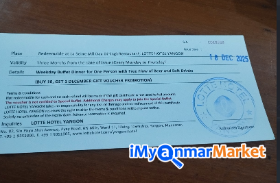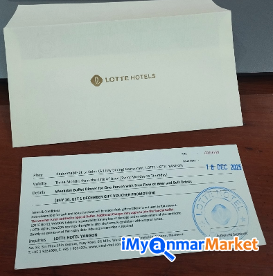 LOTTE Hotel မှာ ညစာ Buffet စားခွင့် Voucher ပါ။ Free Flow အဝစားရမှာပါ။ $35 ကိုမှ တစ်သိန်းကျော်ကျတာကို 60,000 Ks လေးနဲ့ထားပေးပါမယ်နော်။ သွားမစားဖြစ်လို့ပါ။