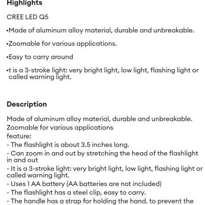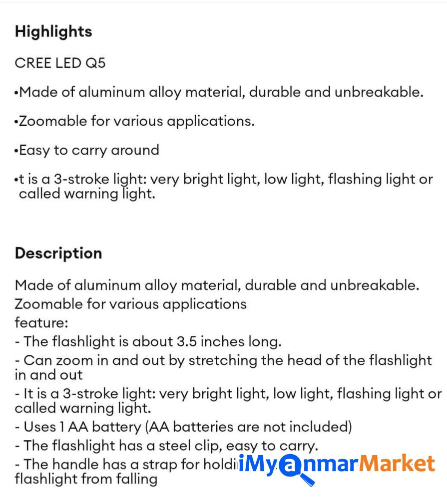 ဒီလက်ကိုင်မီးကို အရည်အသွေးမြင့် အလူမီနီယမ် အလွိုင်းဖြင့် ပြုလုပ်ထားပြီး ပေါ့ပါးသလို ခိုင်ခံ့လည်း ဖြစ်ပါတယ်။ Zoom ဆွဲနိုင်တဲ့ ဒီဇိုင်းကြောင့် အလင်းကို ပြန့်စေချင်သလို စူးစေချင်သလို လိုအပ်သလို ပြောင်းလဲ အသုံးပြုနိုင်ပါတယ်။