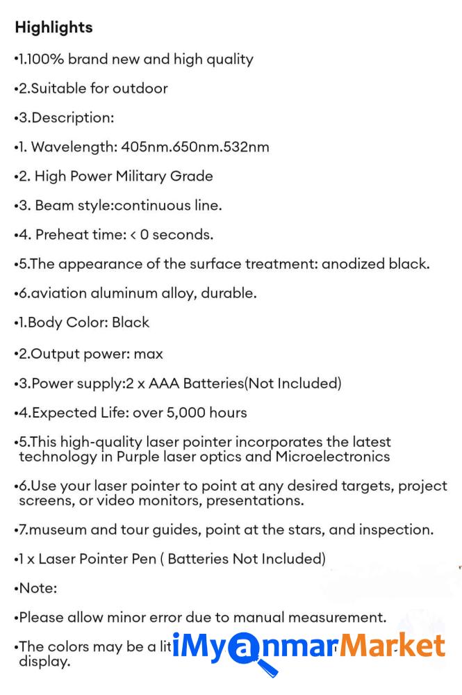 • လေဆာညွှန်ပြတံ ၁ ခု (ဘက်ထရီများ မပါဝင်ပါ)