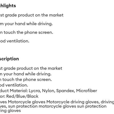 ဤလက်အိတ်သည် အရည်အသွေးမြင့် ထုတ်ကုန်ဖြစ်ပြီး မော်တော်ဆိုင်ကယ်မောင်းနှင်ရာတွင် လက်ကို တည်ငြိမ်စေကာ ထိန်းချုပ်မှုကောင်းမွန်စေသည်။ လက်အိတ်တပ်ထားရင်း ဖုန်းစကရင်ကိုလည်း လွယ်ကူစွာ အသုံးပြုနိုင်ပြီး လေဝင်လေထွက်ကောင်းသောကြောင့် အပူမတက်၊ ချွေးမတက်စေပါသည်။
