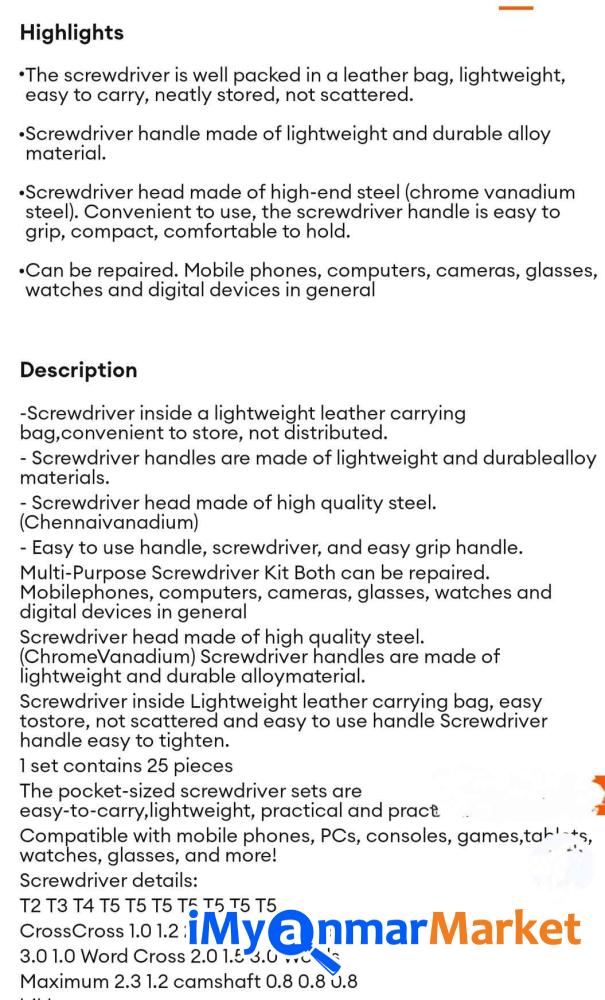 "Screwdriver ကို ကောင်းကောင်းထုပ်ပိုးထားပြီး အလေးချိန်ပေါ့ပါးကာ သယ်ဆောင်ရလွယ်ကူကာ သေသပ်စွာသိမ်းဆည်းထားပြီး ပြန့်ကျဲမနေပါ။